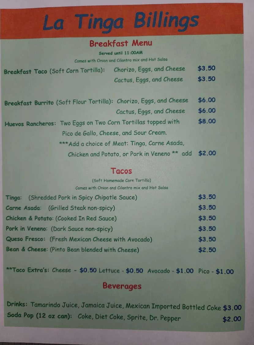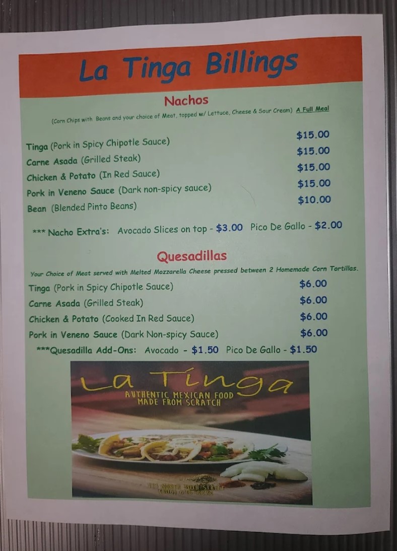 Tucked away at 113 N 30th St. in Billings, MT, La Tinga stands as a vibrant beacon of authentic Mexican cuisine. This establishment is far more than a simple restaurant; it is a labor of love orchestrated by Evelyn, a dynamic force who serves simultaneously as owner, chef, and hostess. Channeling a long lineage of family cooks, she ensures that every guest receives the warm, generous hospitality one might expect when visiting a beloved grandmother’s kitchen. The space itself is intimate and bright, decorated with lush plants and cherished photographs that capture the restaurant’s deep connection to its community. Within this casual, colorful atmosphere, freshness is paramount. The kitchen produces a wide array of meticulously prepared dishes, ranging from savory Breakfast Burritos and Tinga Nachos to distinctively spiced Chile Rellenos and Chicken & Potato Quesadillas. Whether you are craving a Carne Asada Taco, a Tinga Tostada, or simply a Bean & Cheese Burrito, the portions are large, and the ingredients are strictly fresh. Open for breakfast and lunch until 2:00 PM, La Tinga invites you to experience a place where the service is personal, the environment is spotless, and the food is undeniably delicious.